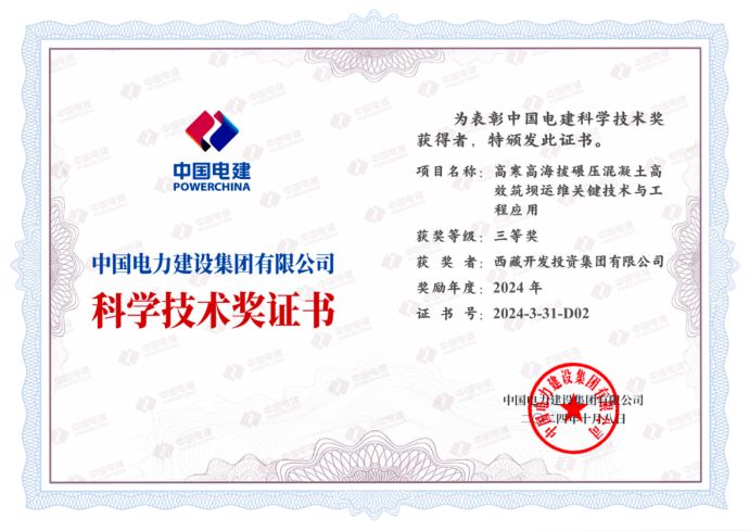 日前,中國電建集團公布了2024年度中國電建科學技術獎獲獎項目名單,西藏開投集團果多水電站創新成果——“高寒高海拔碾壓混凝土高效筑壩關鍵技術與工程應用”榮獲中國電建科學技術獎三等獎。