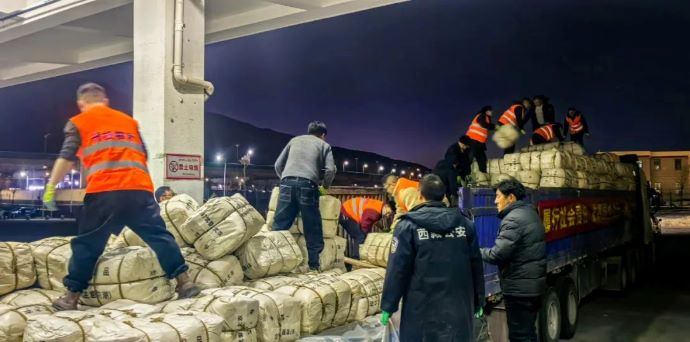 1月9日20點,拉薩貢嘎國際機場貨站內燈火通明,西藏開投集團20多名工作人員正在緊急卸裝救援物資,一件件棉衣棉被下了飛機立即裝車,準備運往災區。