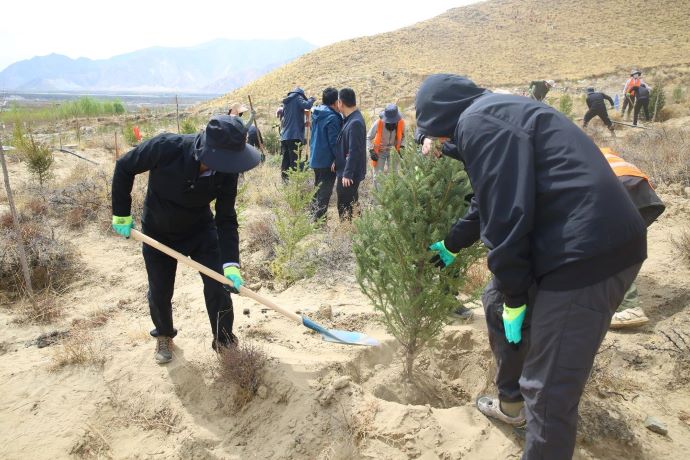 在技術人員的指導下,大家揮鍬鏟土、填土圍堰、平整踩實、提水灌溉,現場一派熱火朝天的勞動景象。一棵棵樹苗錯落有致、迎風挺立、生機勃勃,不僅為大地增添了綠色,也承載了大家對美好生態環境的期望。