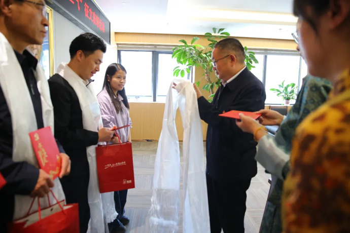 祁騰武向在“七一”當天入黨的5名黨員代表發放“政治生日卡”和紀念品。