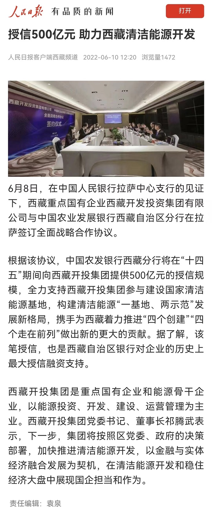 (編者按)6月10日,《人民日報》客戶端西藏頻道報道了《授信500億元 助力西藏清潔能源開發》。《西藏日報》2022年6月10日在第2版“高原要聞”欄目刊登文章,報道《授信500億元|西藏開投集團與中國農發行西藏分行簽訂全面戰略合作協議》。西藏電視臺2022年6月10日在西藏電視臺影視文化頻道《今晚九點》欄目報道了《授信500億元|西藏開投集團與中國農發行西藏分行簽訂全面戰略合作協議》,《珠峰云》平臺同步播放。新華網、經濟日報、西藏衛視、西藏日報客戶端、網信西藏、今日頭條等媒體均報道了相關新聞。全文如下: