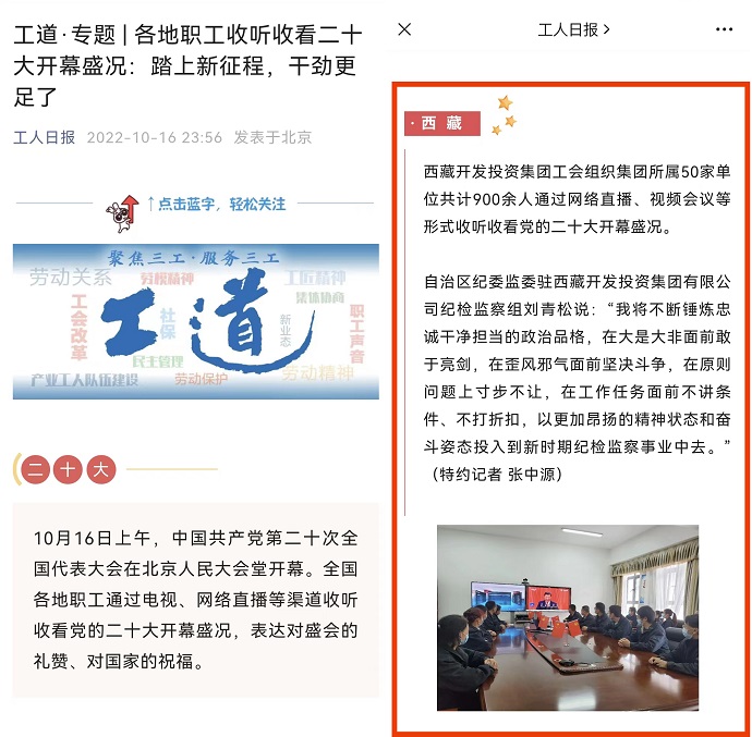 (編者按)《工人日報》2022年10月16日報道《各地職工收聽收看二十大開幕盛況:踏上新征程,干勁更足了》專題報道,文章引用部分集團公司新聞信息。