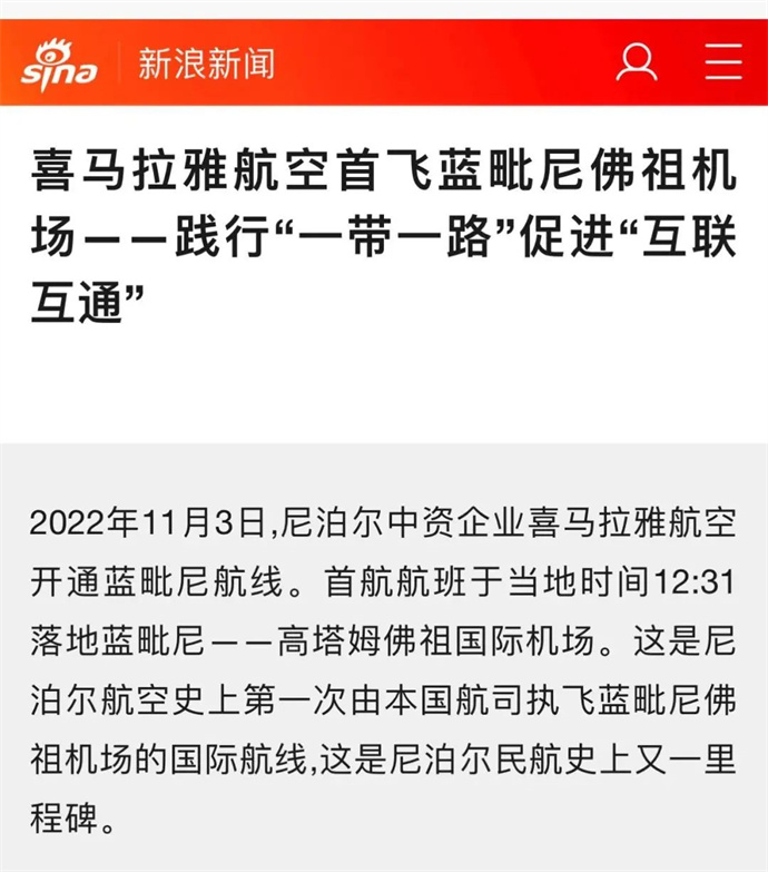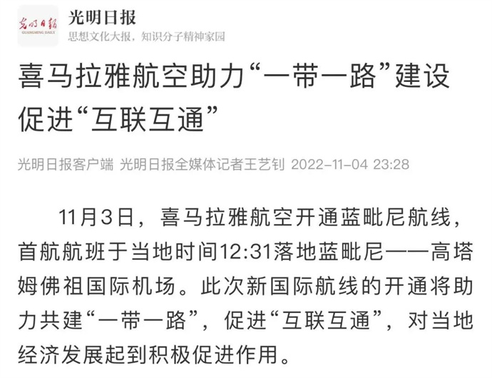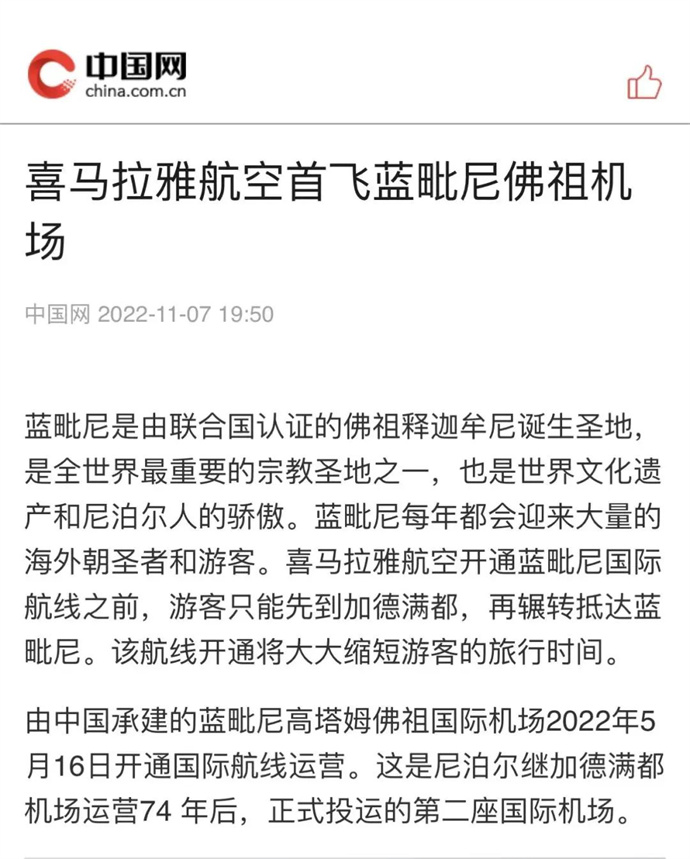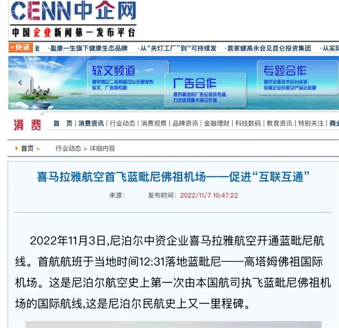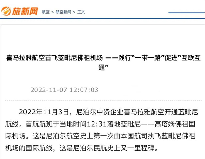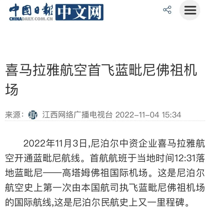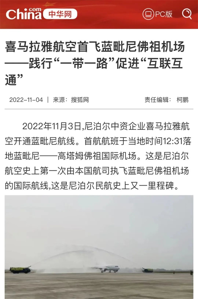 中華網、中國網、中企網、中國日報、光明日報、中國旅游新聞網、中國西藏新聞網、拉薩新聞網等媒體報道喜航開通加德滿都至藍毗尼航線