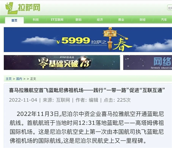 (編者按) 2022年11月4日至9日,中華網、中國網、中企網、中青網、中國日報網、光明日報、騰訊網、新浪網、搜狐網、今日頭條、中國旅游新聞網、中國西藏新聞網、拉薩新聞網、西藏生活網、西藏視窗、每日經濟西藏、西藏途游網等媒體報道了《喜馬拉雅航空首飛藍毗尼佛祖機場》文章。摘要如下: