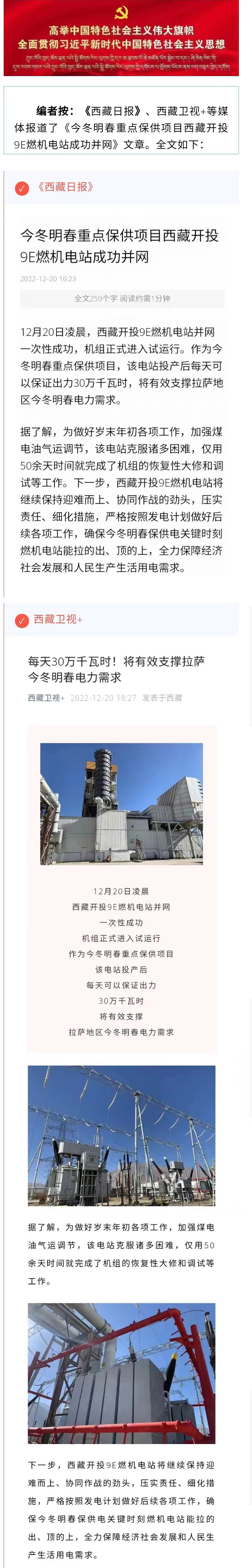 “學習強國”、《西藏日報》報道西藏開投9E燃機電站成功并網