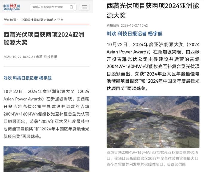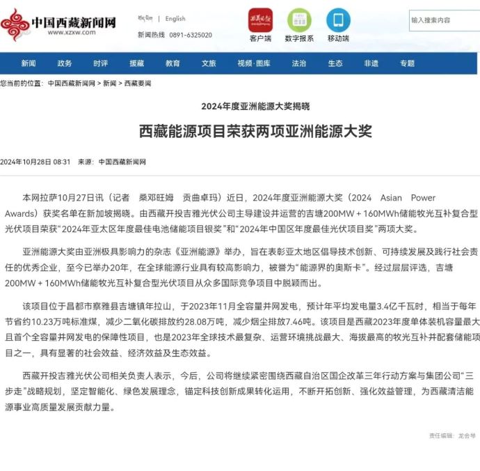 編者按:近日,中國科技網、科技日報、西藏日報、西藏發布、中國西藏新聞網、西藏商報、昌都發布等多家媒體集中宣傳報道了西藏開投吉雅光伏公司榮獲兩項亞洲能源大獎相關事宜。摘要如下: