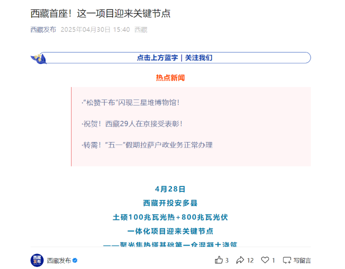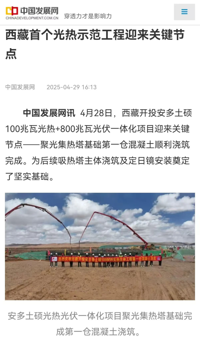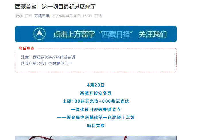 媒體報道丨全球海拔最高、西藏首個塔式光熱電站開工建設