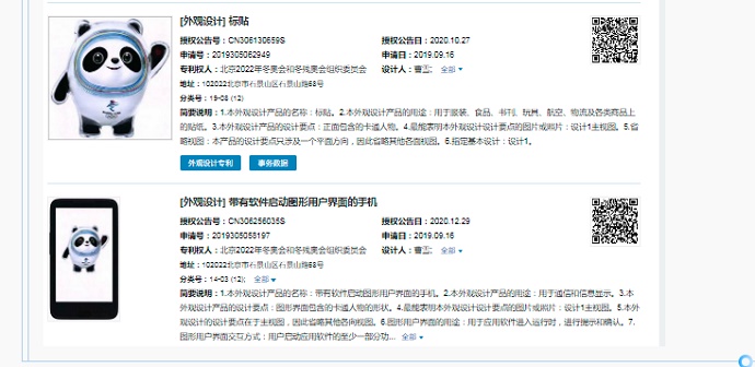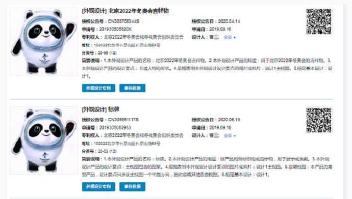 2019年9月,北京冬奧組委向國家知識產權局提交了4件與冰墩墩相關的外觀設計專利,并于2020年獲得授權。