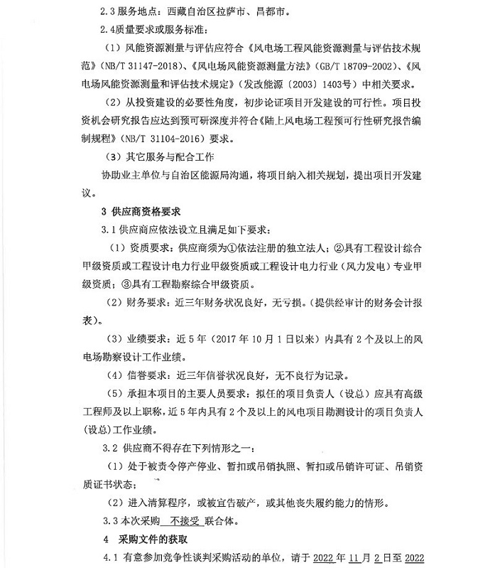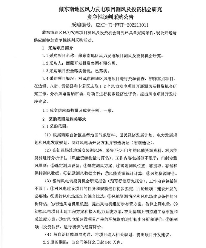 藏東南風力發電項目測風和投資機會研究競爭性談判采購公告