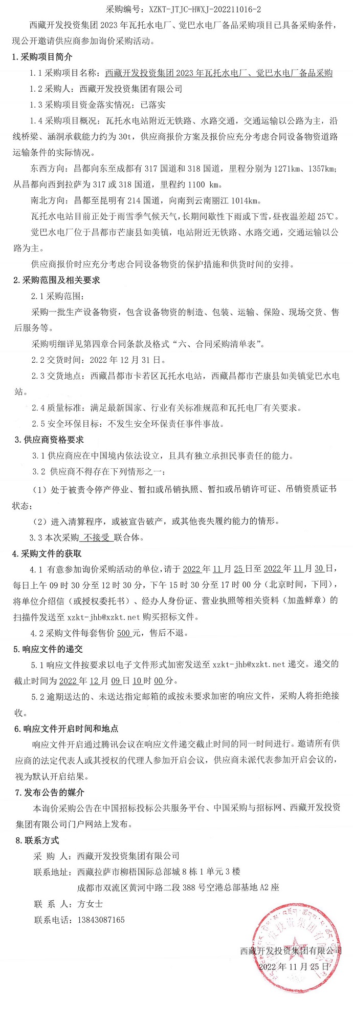 西藏開發投資集團2023年瓦托水電廠、覺巴水電廠備品