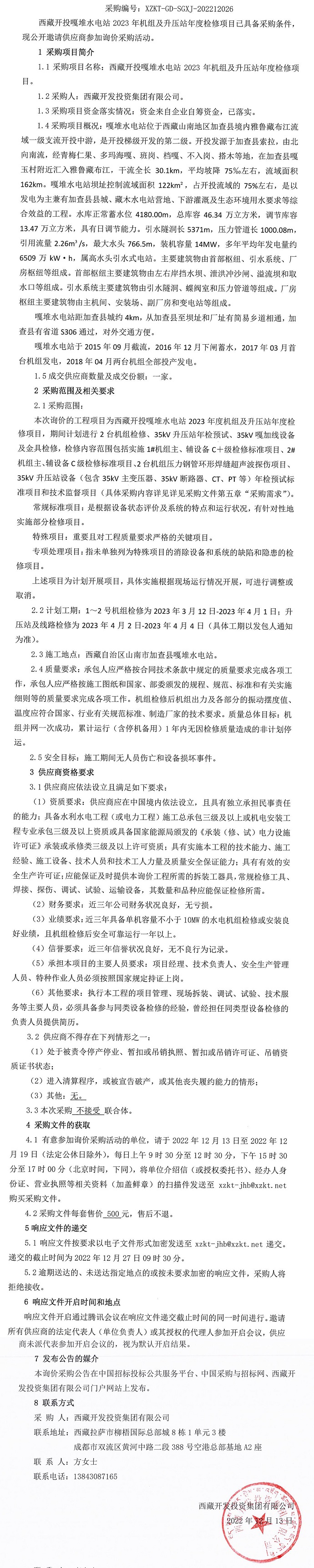 西藏開投嘎堆水電站2023年機組及升壓站年度檢修項目