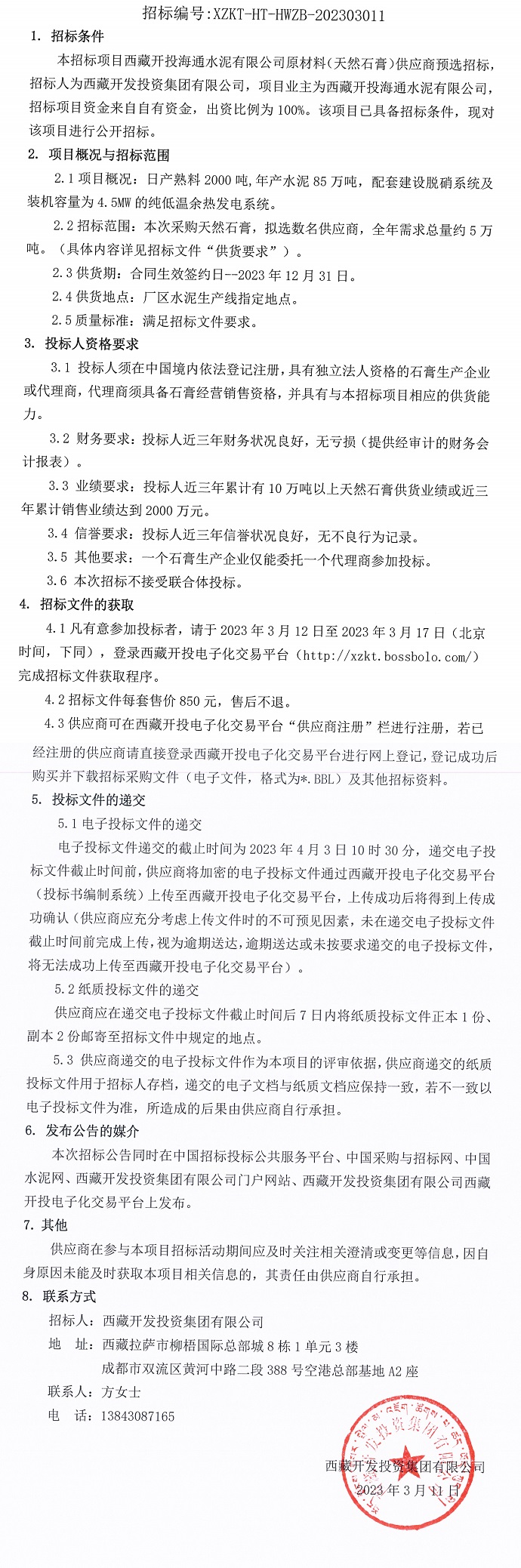 西藏開投海通水泥有限公司大宗物資(氨水)