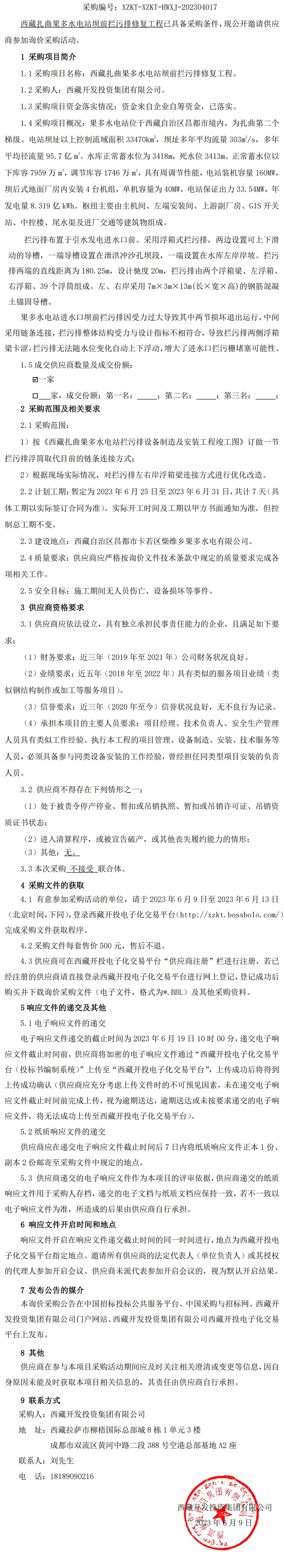 西藏扎曲果多水電站壩前攔污排修復工程詢價采購公告