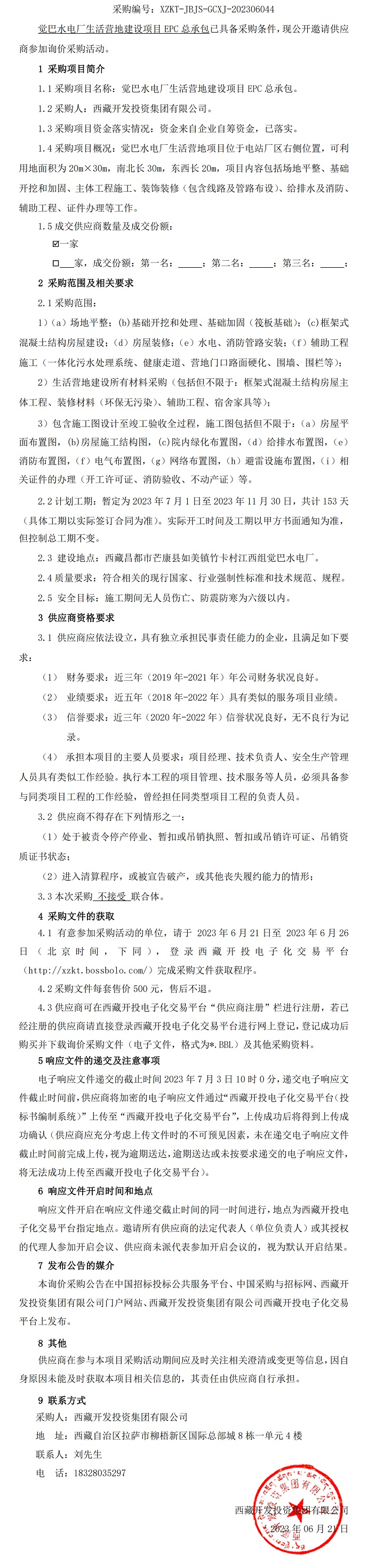 覺巴水電廠生活營地建設項目EPC總承包詢價采購公告