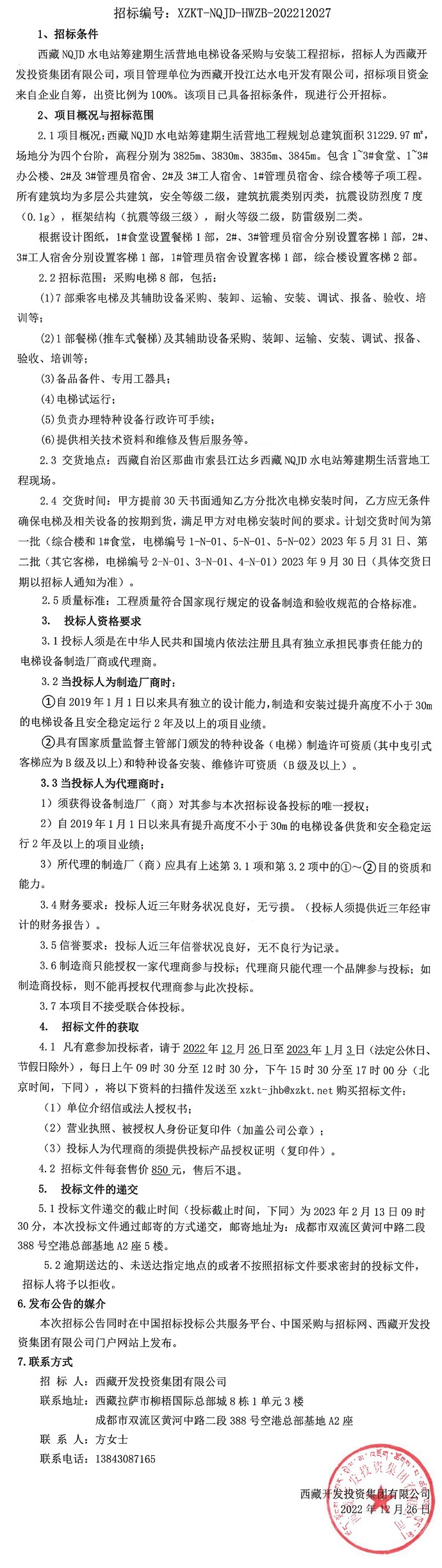 西藏NQJD水電站籌建期生活營地電梯設備采購與安裝工程