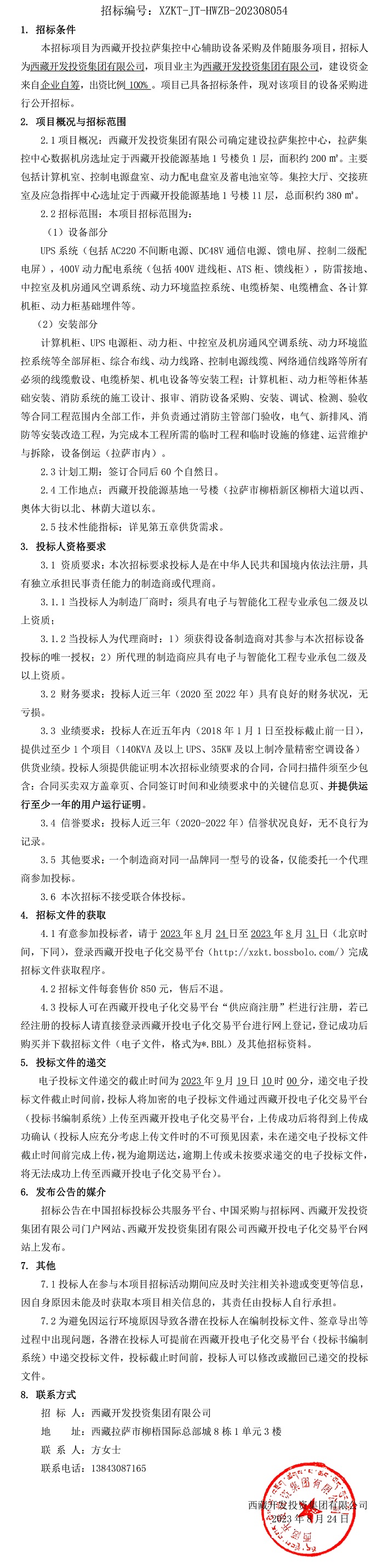 西藏開發投資集團有限公司拉薩集控中心輔助設備采購及伴隨服務項目招標公告