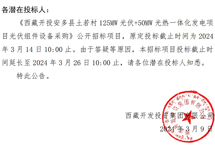 一體化發電項目光伏組件設備采購》投標截止時間的公告