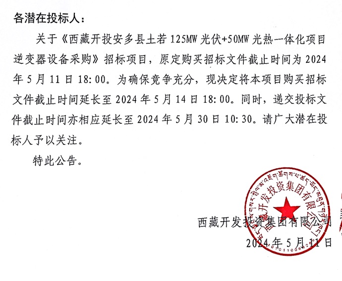 關于延長《西藏開投安多縣土若125MW光伏+50MW 光熱一體化項目逆變器設備采購招標》購買招標文件截止時間的公告