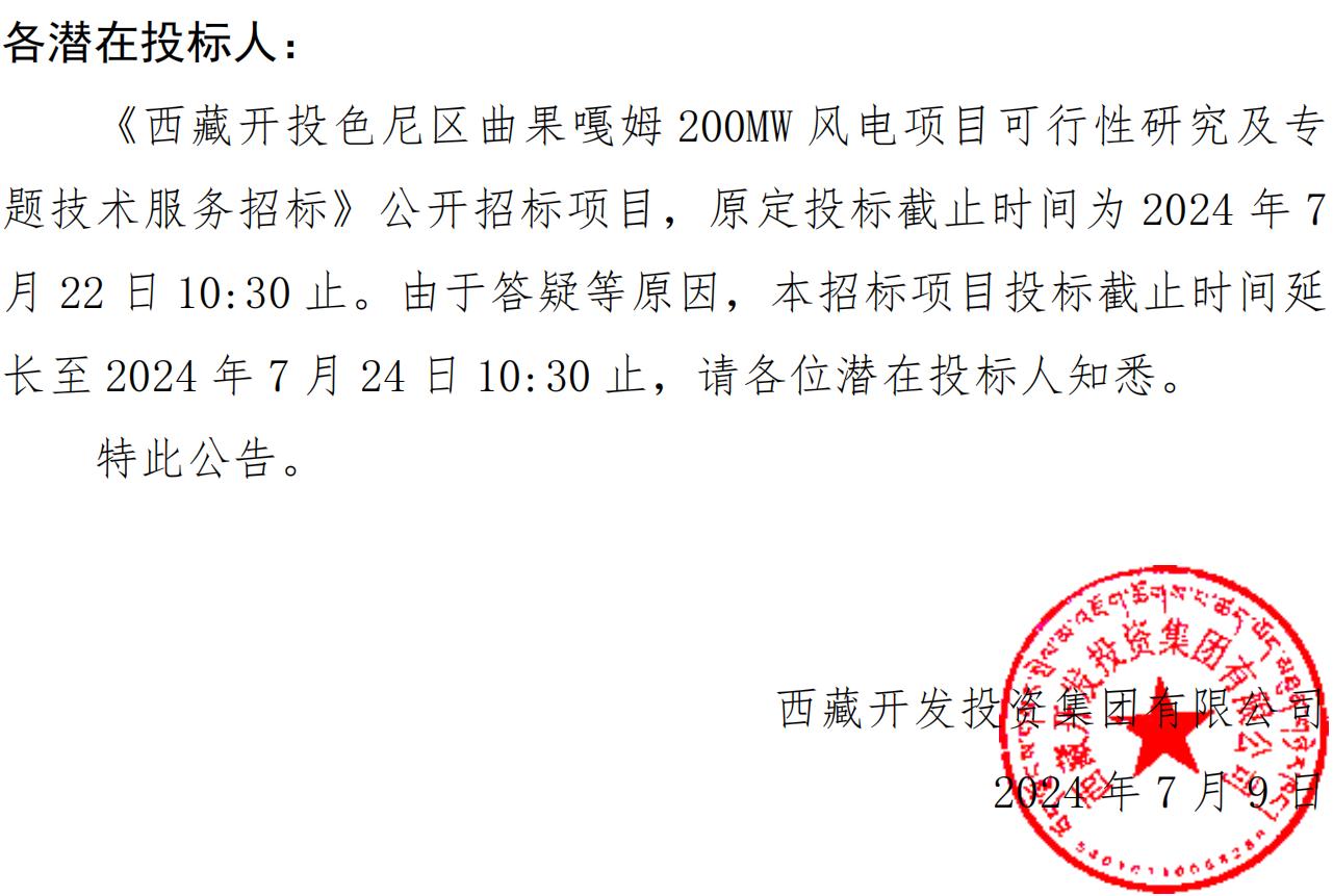 關于延長《西藏開投色尼區曲果嘎姆200MW風電項目可行性研究及專題技術服務招標》投標截止時間的公告