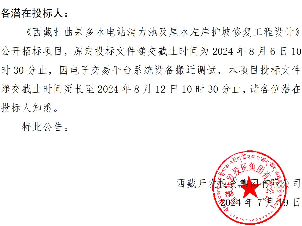 關于延長《西藏扎曲果多水電站消力池及尾水左岸護坡修復工程設計》投標文件遞交截止時間的公告
