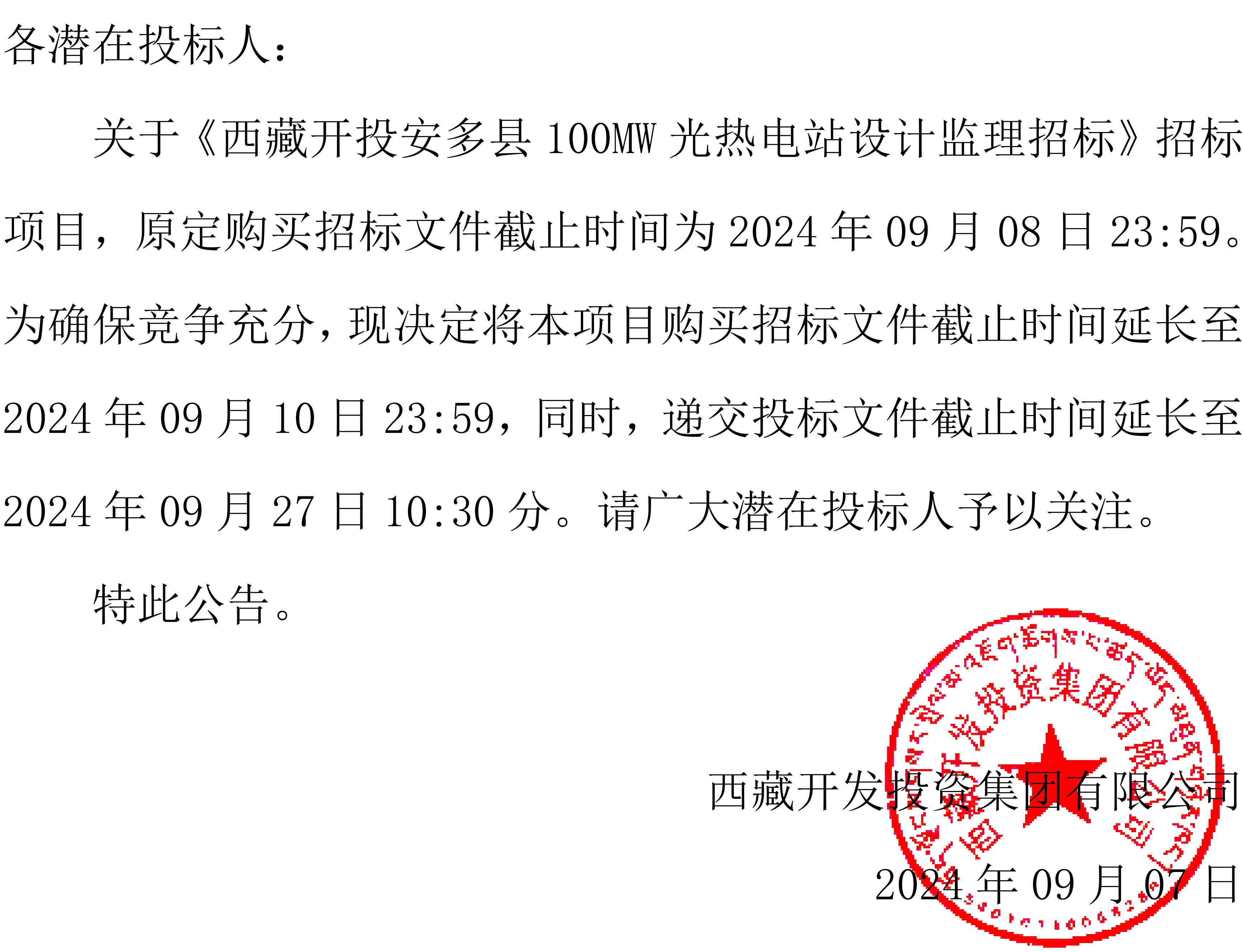 關于延長《西藏開投安多縣100MW光熱電站設計監理 招標》購買招標文件截止時間的公告