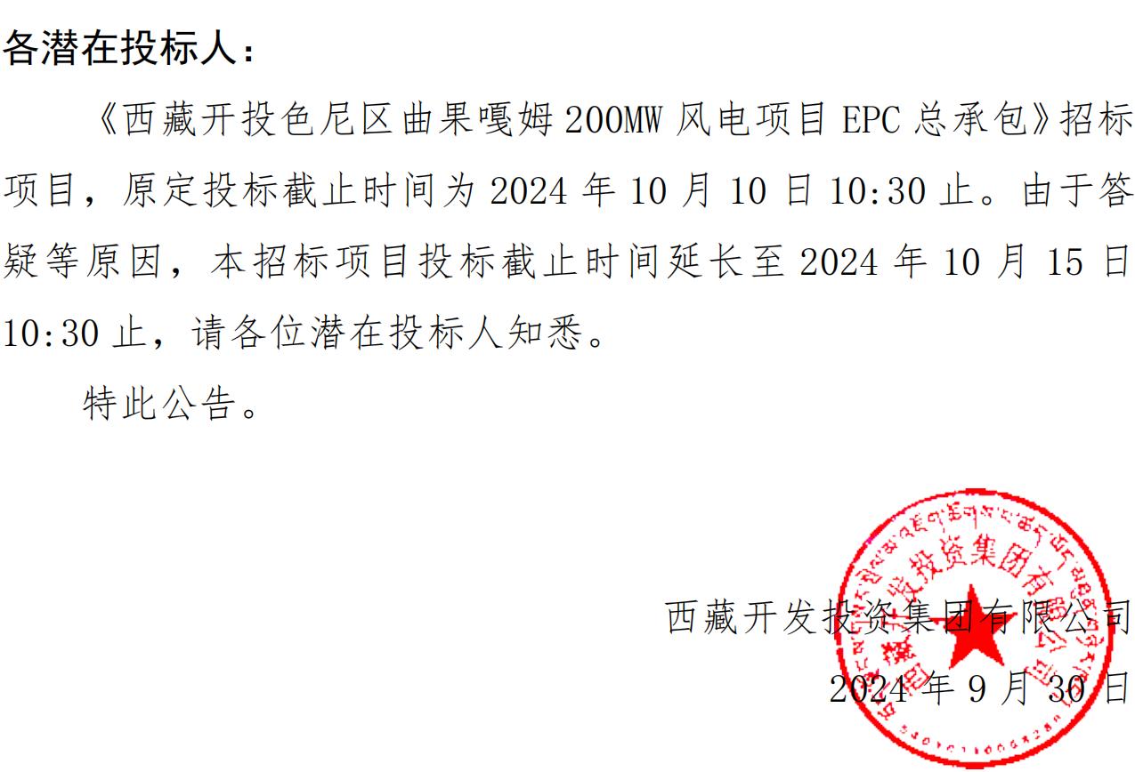 關于延長《西藏開投色尼區曲果嘎姆200MW風電項目EPC總承包》投標截止時間的公告