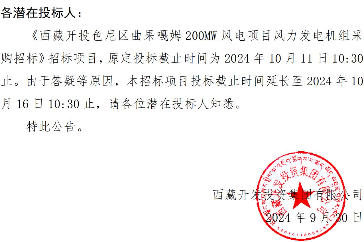 關于延長《西藏開投色尼區曲果嘎姆200MW風電項目風力發電機組采購招標》投標截止時間的公告