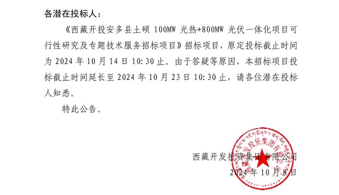 關于延長《西藏開投安多縣土碩100MW光熱+800MW光伏一體化項目可行性研究及專題技術服務招標項目》投標截止時間的公告