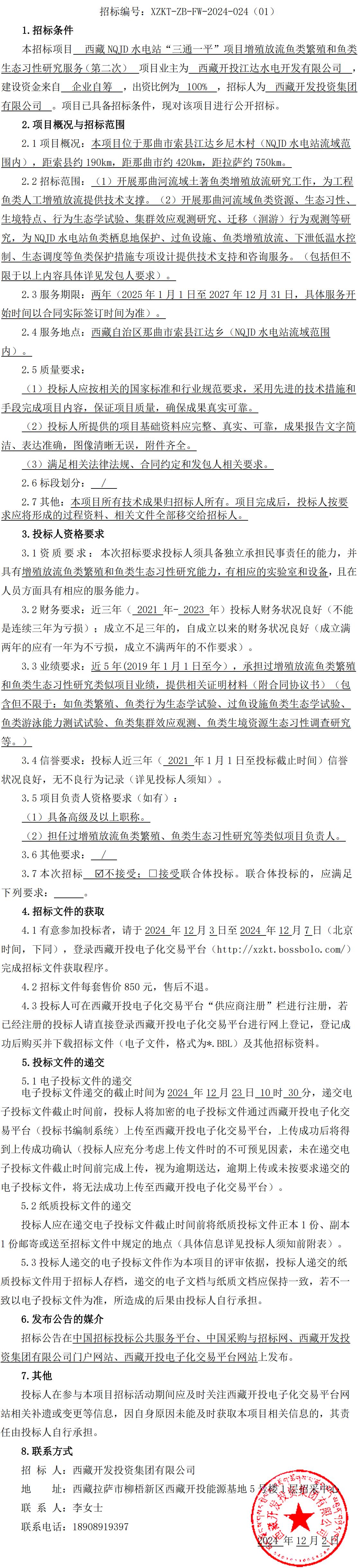西藏 NQJD 水電站“三通一平”項目增殖放流魚類繁殖和魚類生態習性研究服務(第二次)招標公告