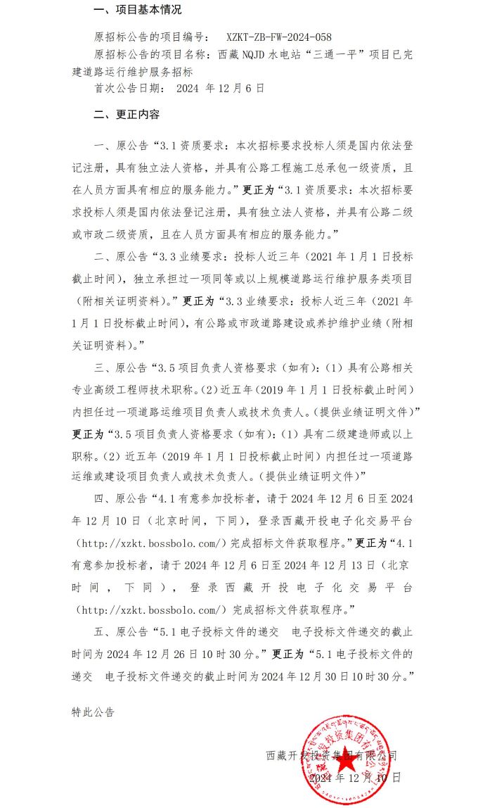 關于《西藏NQJD水電站“三通一平”項目已完建道路運行維護服務招標》的更正公告