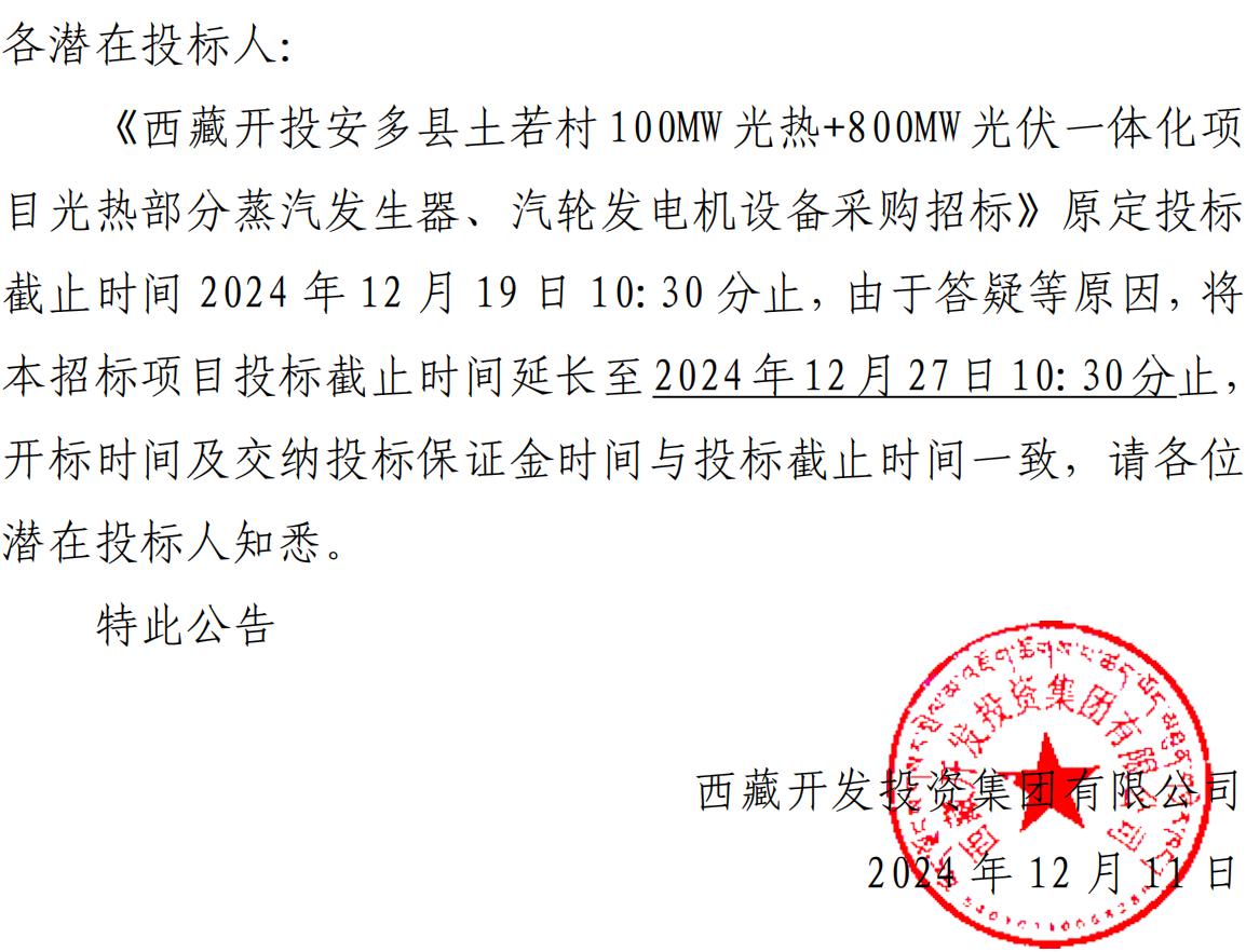 關于延長《西藏開投安多縣土碩 100MW 光熱+800MW 光伏一 體化項目光熱部分蒸汽發生器、汽輪發電機設備采購招標》投 標截止時間的公告