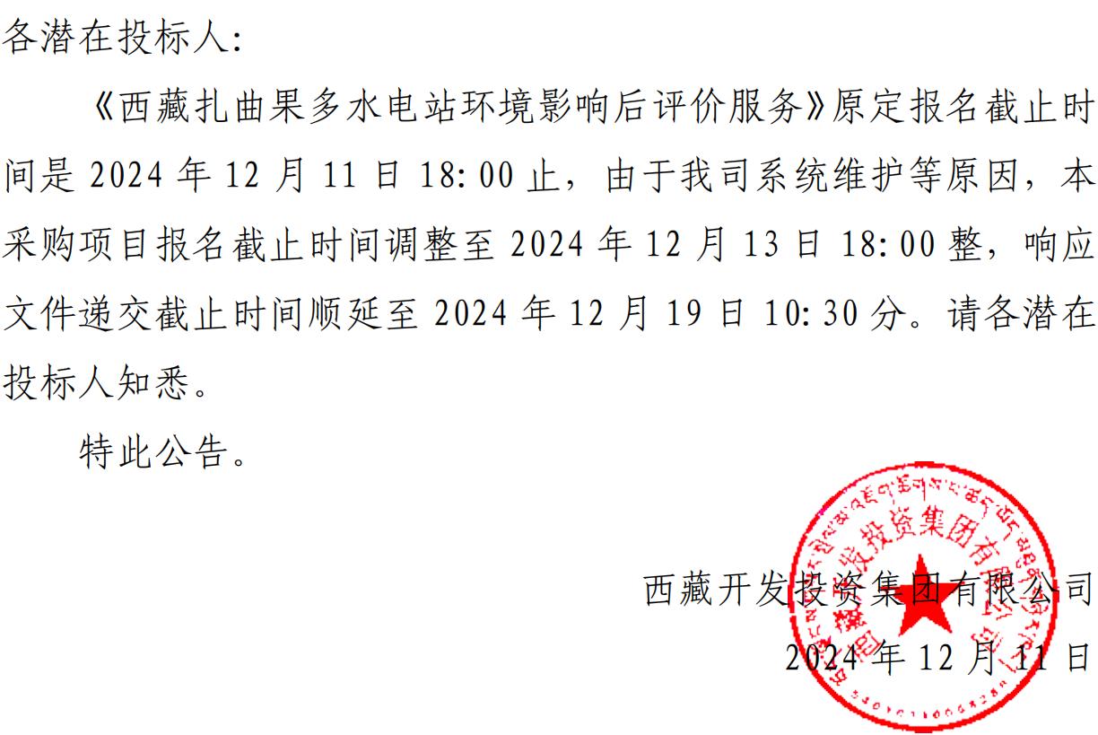 關于延長《西藏扎曲果多水電站環境影響后評價服務》詢價報名截止時間的公告