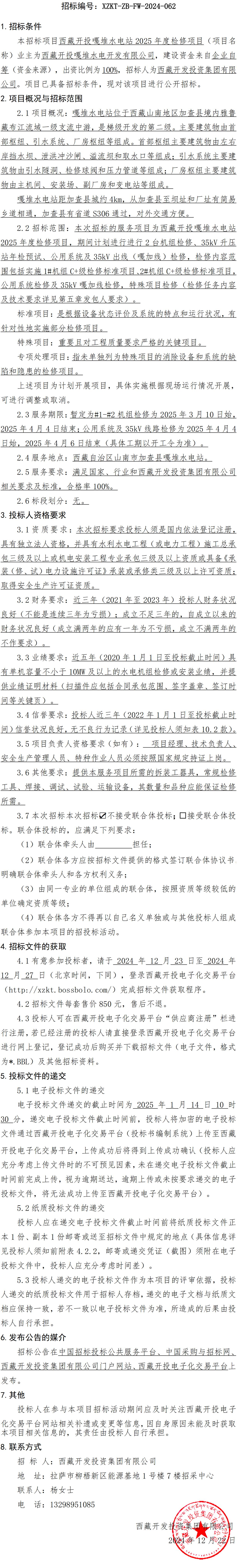 西藏開投瓦托電廠及新榮水電站2025年度檢修服務招標公告
