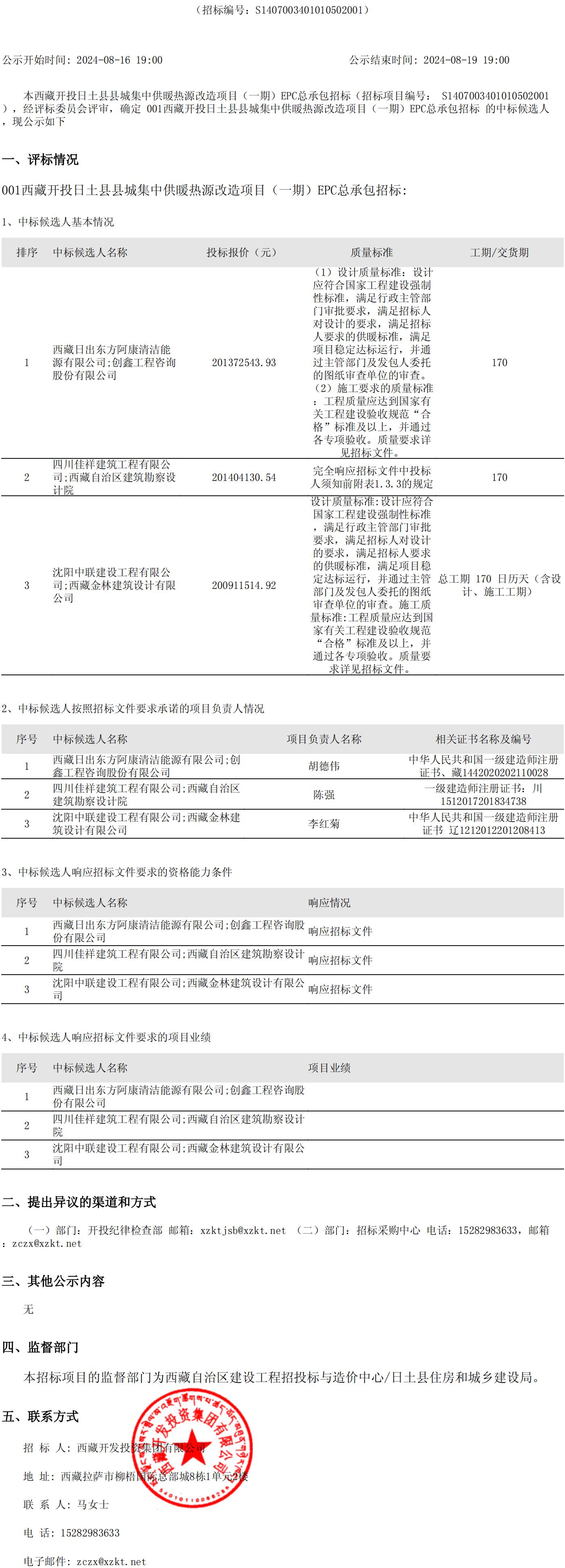 西藏開投日土縣縣城集中供暖熱源改造項目(一期)EPC總承包招標項目中標結果公告